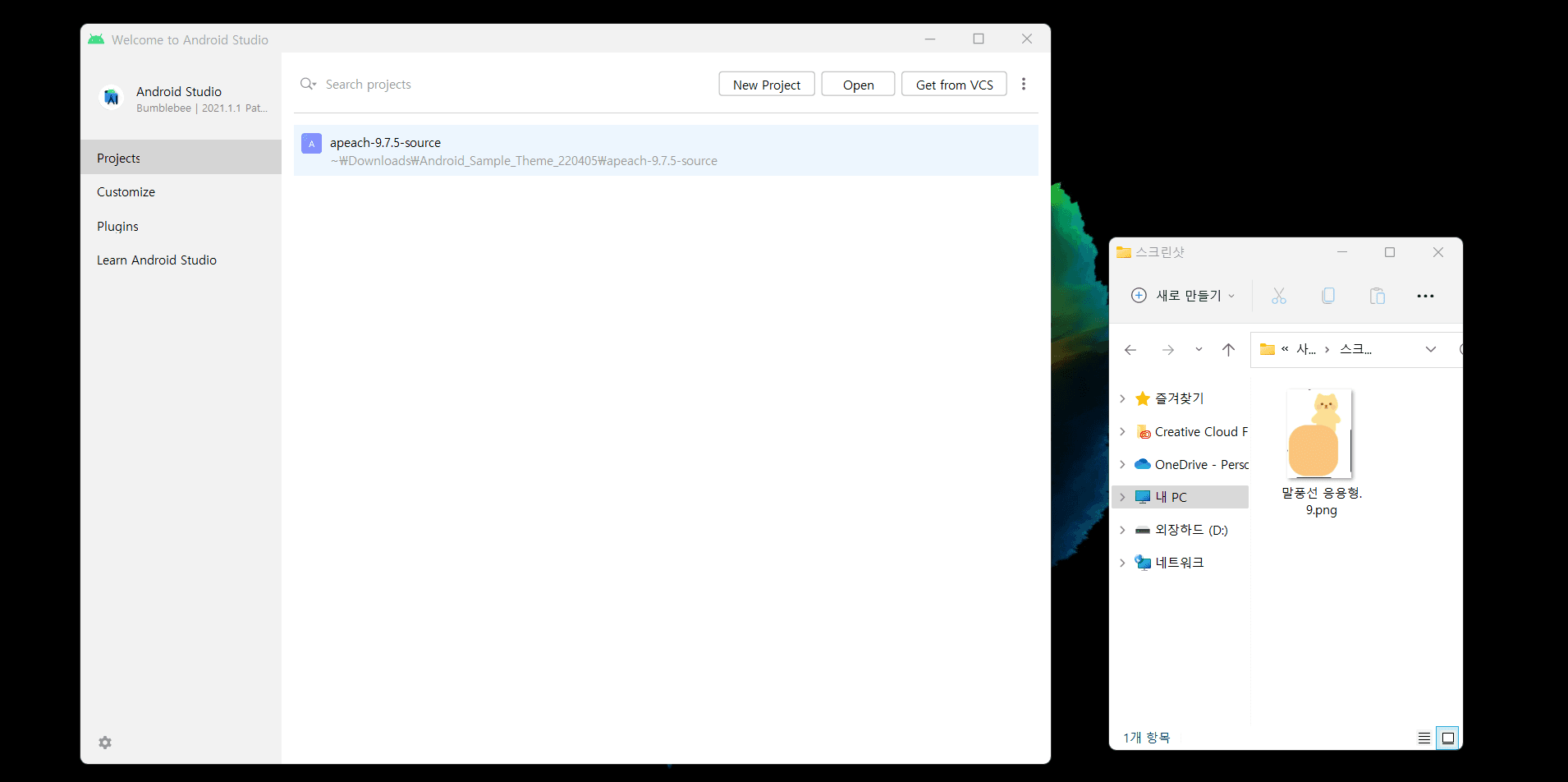 프로젝트가 열려있지 않은 안드로이드 스튜디오 초기 화면에서 Open을 눌러 나인패치 이미지를 선택하거나 파일탐색기에서 나인패치 이미지를 드래그 앤드 드롭해도 열립니다.
