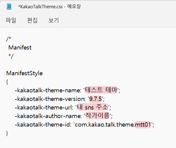 KakaoTalkTheme.css 문서를 열어 ManifestStyle 부분을 수정해 줍니다.